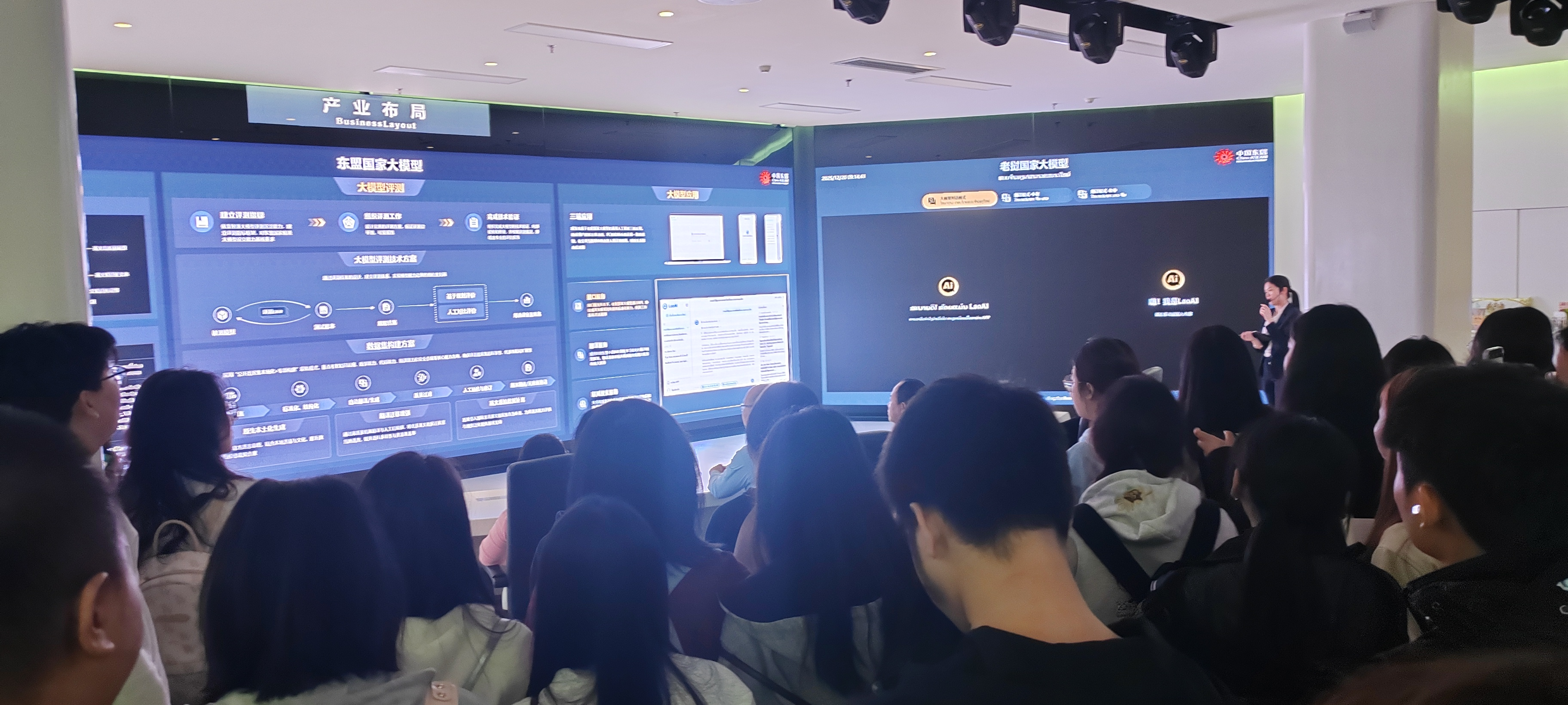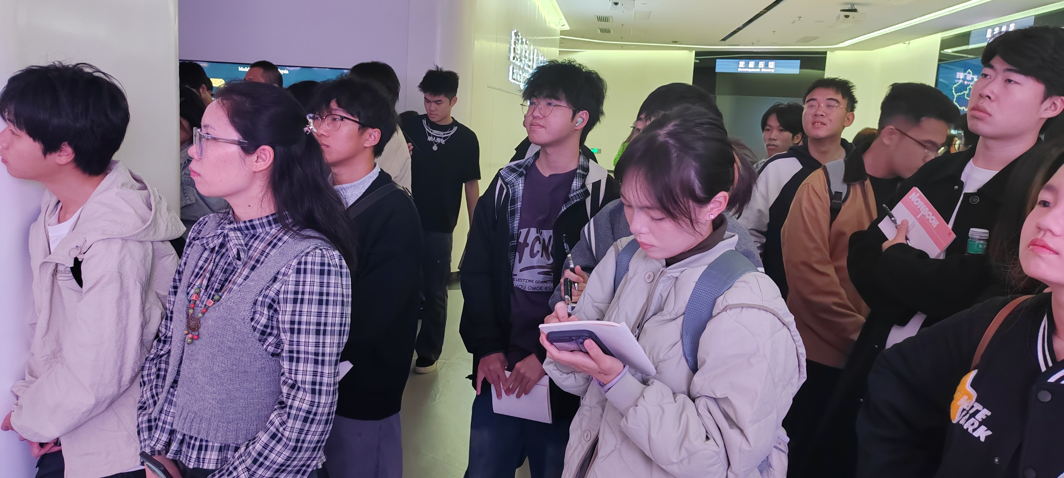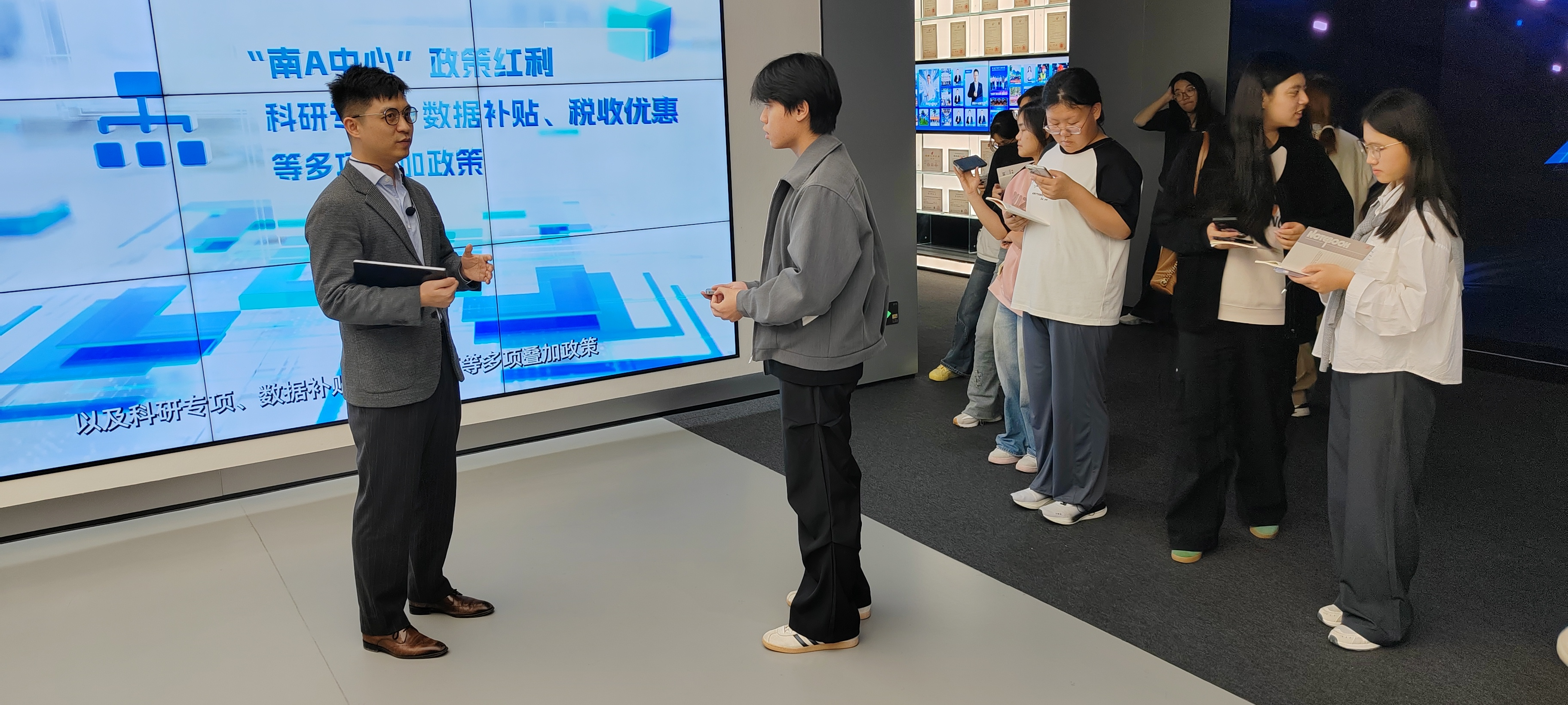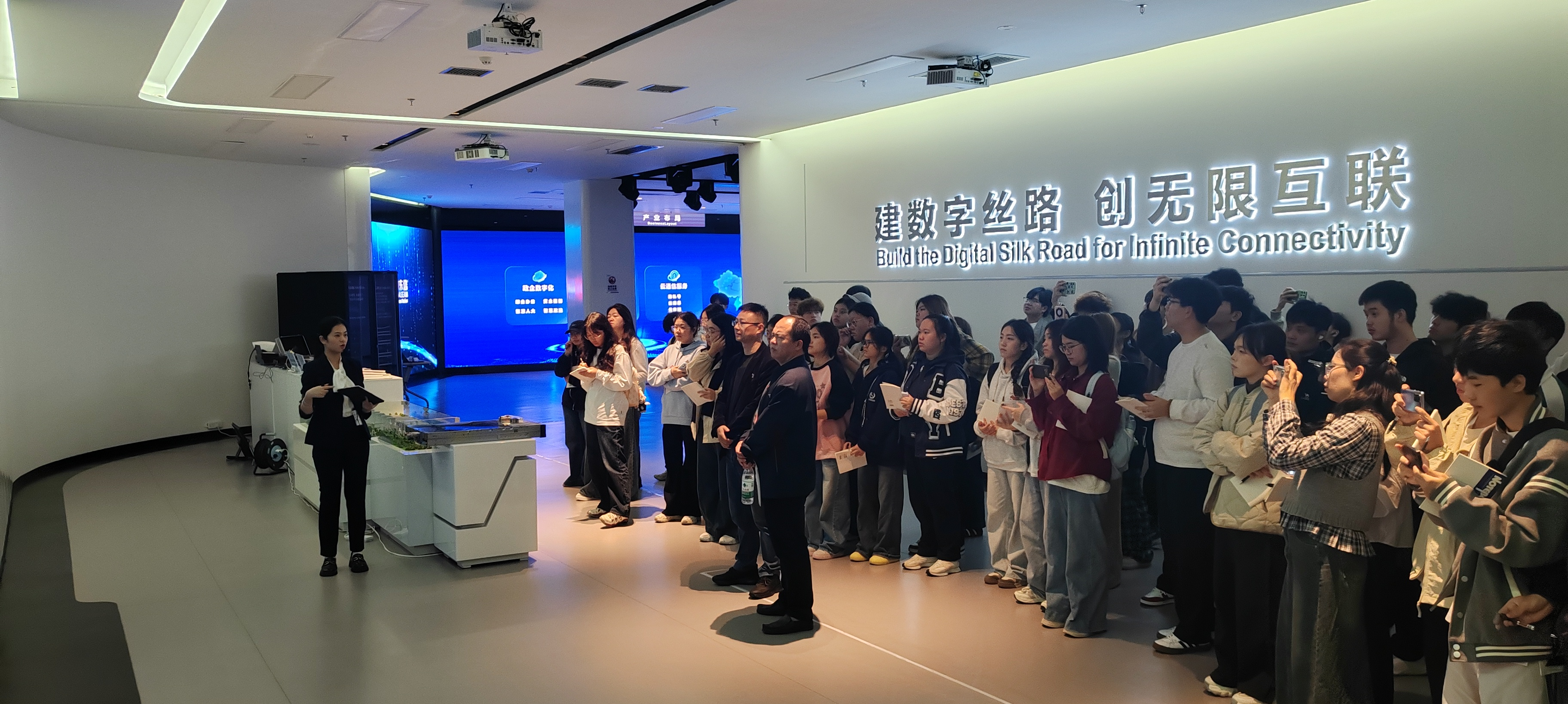当日上午,实践团队首站抵达国家重大战略项目中国—东盟信息港。在这里,同学们在展厅不仅直观感受到了这一国际性信息枢纽的宏伟规模与战略意义,更通过两场紧扣时代脉搏的专题分享,深入理解了数智技术如何重塑现代管理模式。