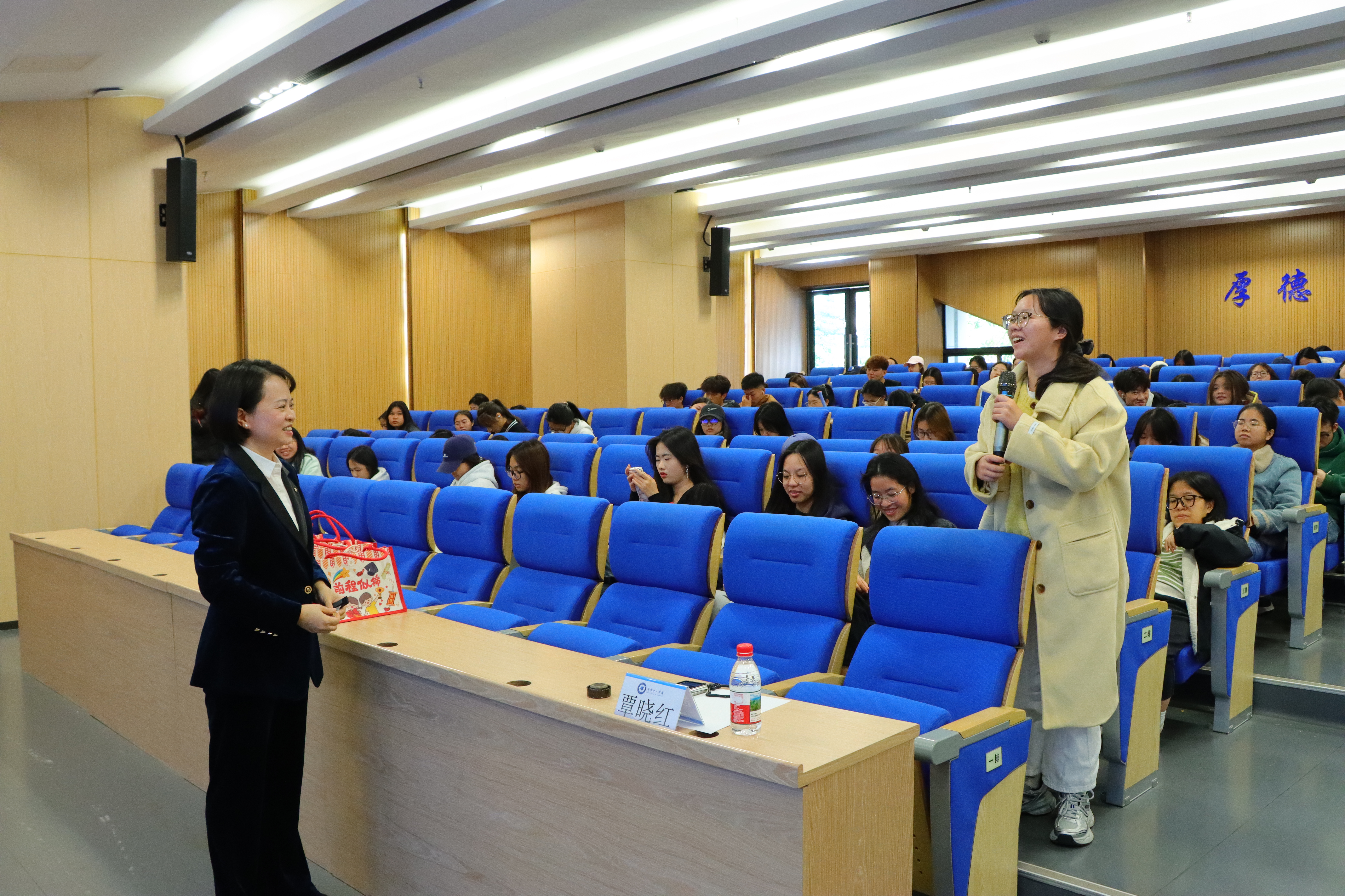 覃晓红女士扎根银行业28年,从基层岗位逐步成长为总行全球调研专家与分行内训师。分享中,她以亲身经历为主线,系统梳理银行业发展脉络,清晰阐释银行人的成长阶梯,并聚焦“如何把握行业机遇”“如何提升求职竞争力”等学生关切的问题,从应聘条件、面试技巧到职业素养细致剖析。她强调,诚信品格、沟通能力与持续学习意识是金融人不可或缺的素质,并以“脚下有实践厚度、脑中有理论深度、心中有赋能温度”的讲述,为学生揭开银行职场的神秘面纱。