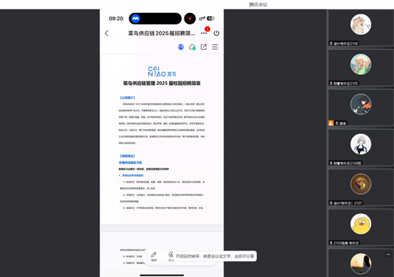 为切实推动毕业生就业工作的有序开展,助力青年学子在职业生涯起始阶段奠定坚实基础,实现个人价值与社会价值的有机统一,我院于3月15日成功举办了“菜鸟供应链 —— 仓储供应链实习生”线上校园招聘会。此次招聘会由学院精心谋划并承办,菜鸟供应链积极参与协办,聚焦仓储供应链岗位,为众多学子提供了宝贵的实习与就业契机。商学院2025届毕业生通过线上腾讯会议的形式,共同聆听了来自菜鸟供应链负责人的详尽介绍与专业指导,正式开启职业生涯的探索征程。