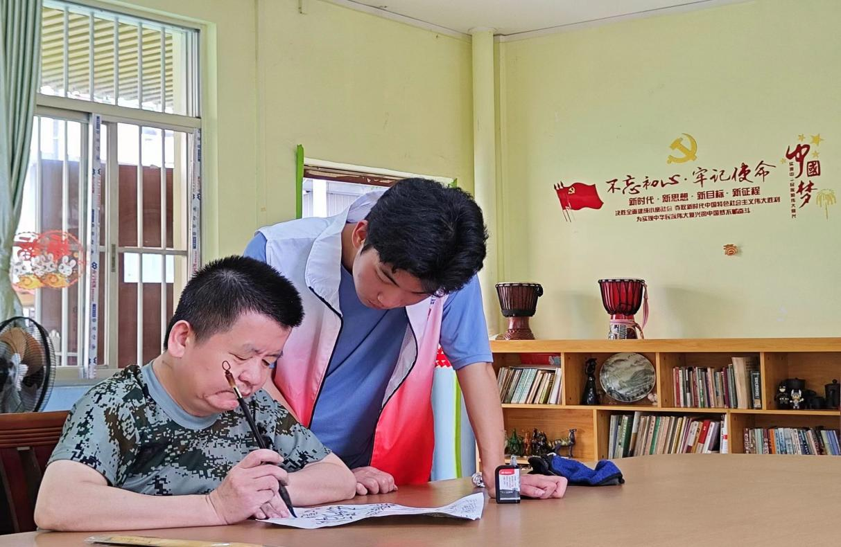 (图为团队成员跟着老人学习毛笔字 陈翠万 摄)