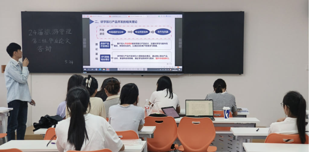 2024年5月24日,商学院2024届旅游管理专业(第二批)本科生毕业论文答辩在A2201、A2203和A2204顺利举行。此次答辩不仅是对学生们四年学术成果的检验,更是他们展示才华、交流思想的重要平台。为确保答辩的顺利进行,旅游管理专业精心组织,将答辩会分为三个小组进行。每个答辩小组均由三位资深教师担任答辩老师,他们具备深厚的学术背景和丰富的教学经验,能够为学生们的论文提供专业的指导和建议。同时,每组还配备了一名答辩秘书,负责现场记录、材料整理等工作,确保答辩流程的高效与规范。