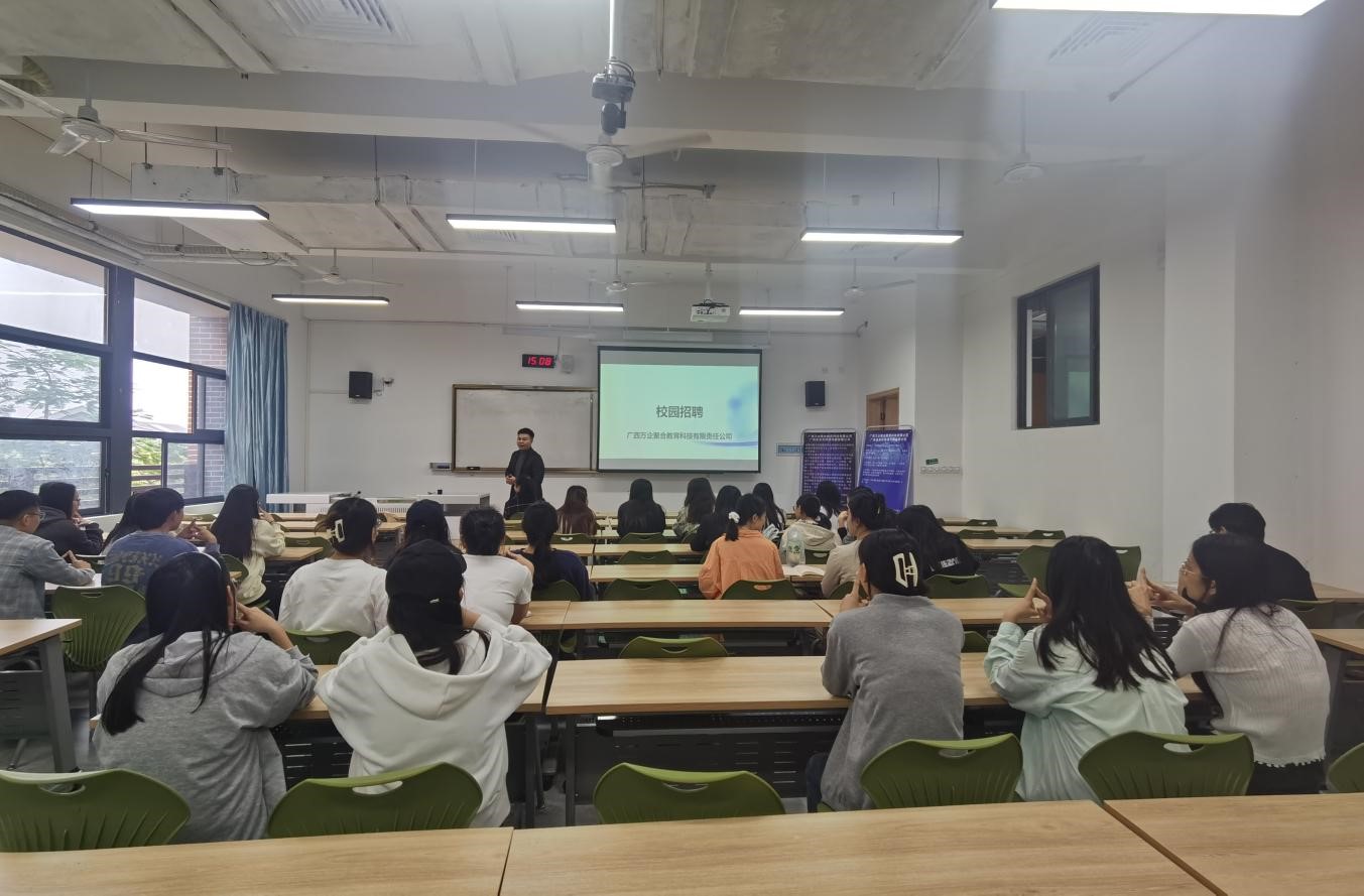为帮助我校2024届毕业生顺利就业,促进校企联系,增加就业渠道,2023年12月13日下午,广西万企聚合教育科技有限公司和广西皮皮鸟网络传媒有限公司校园宣讲会,在我校南宁东盟校区A3202教室召开,来自商学院的2024届毕业生参加了宣讲会。