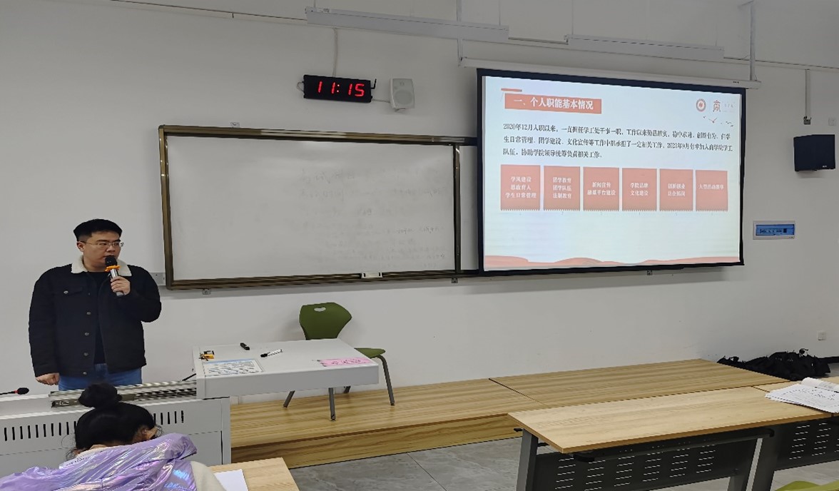 为了深入落实立德树人的根本任务,进一步提高辅导员队伍的综合素质和业务能力,汇报展示工作成绩。2023年12月18日上午,南宁理工学院商学院在多媒体教室A3204教室开展了2023年度辅导员述职报告会。本次述职汇报由商学院党总支书记姚顺良主持,各级辅导员均参与汇报。