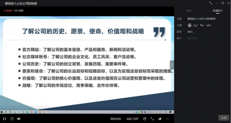 李佳妮老师主讲的课程主要为面试礼仪、面试技能等板块。包括着装、肢体语言、表达语言、个人礼仪等在内的内容,李老师还对面试时常见的问题的回答方式进行了详细的解答。