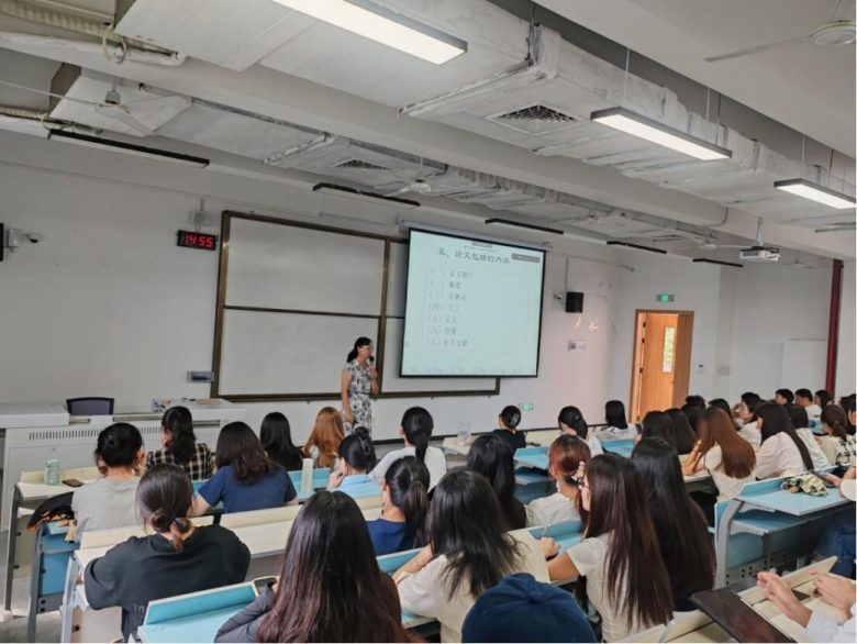大会伊始,刘丽影教授对本届毕业生进行了毕业论文的写作指导,强调论文的重要性和意义。从论文选题,研究方法,资料收集,内容(摘要、引言、理论、现状、问题、成因、对策、结论、致谢、参考文献)常见问题等方面进行详细指导,为同学们答疑解惑。