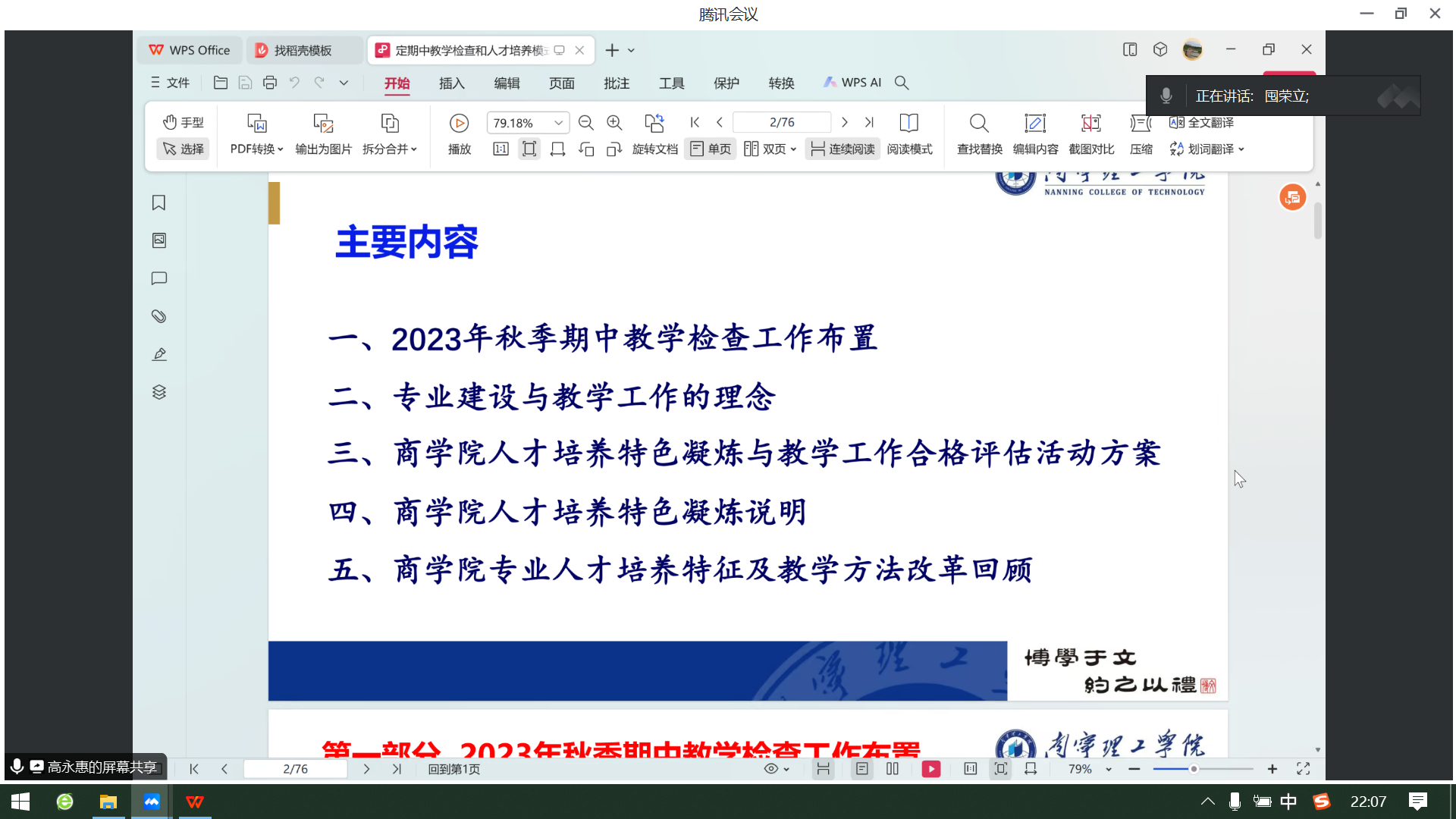 11月2日20:00,商学院以线上形式召开期中教学检查工作动员与人才培养特色凝炼及教学工作合格评估内容学习会议。会议由囤荣立副院长主持,高永惠院长主讲,全院教职员工参会学习。