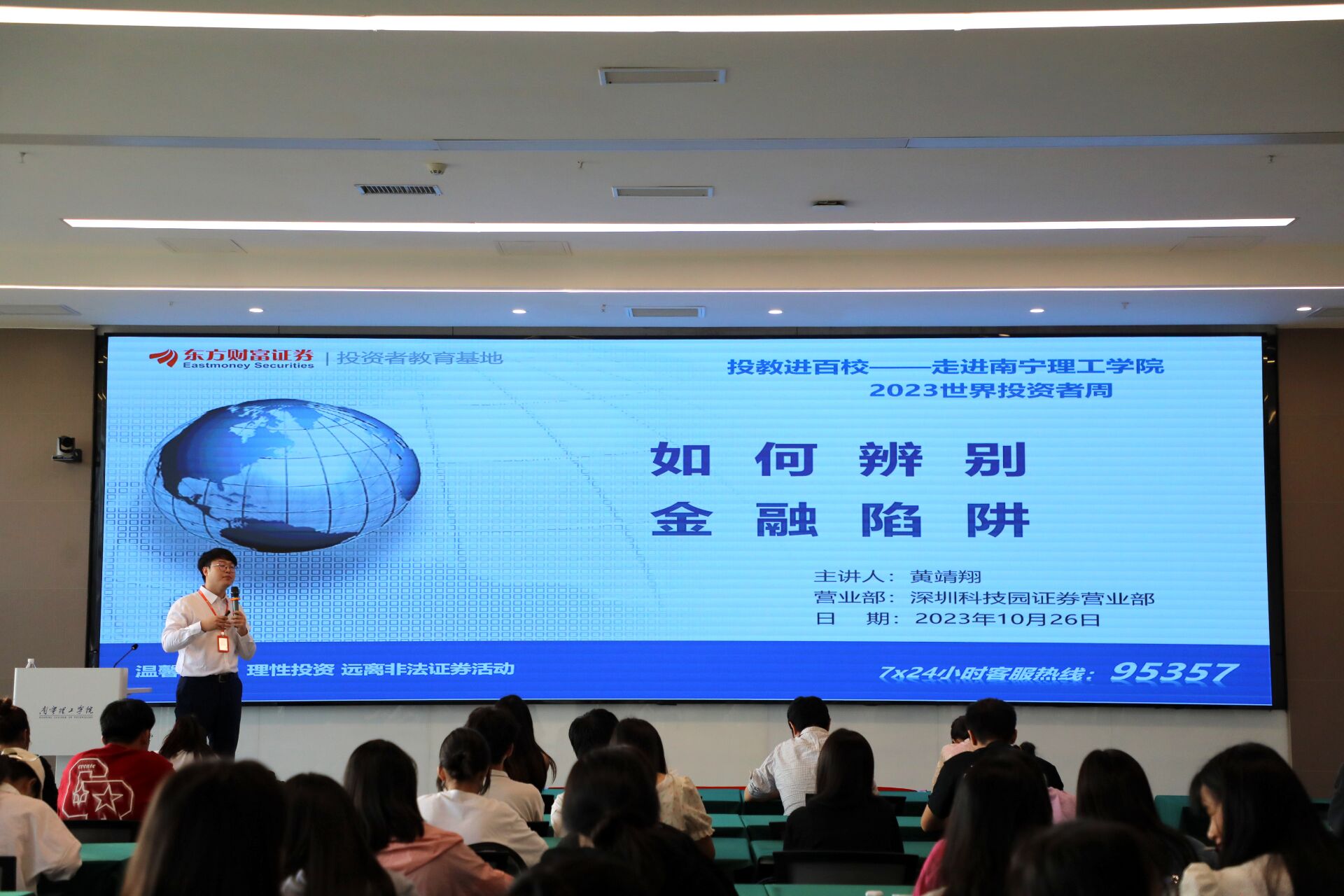 为提高同学们对金融陷阱的认识和警惕性,帮助他们辨别金融陷阱。2023年10月26日下午,南宁理工学院商学院“如何辨别金融陷阱”专题讲座于图书馆618室开展。本次讲座由深圳科技园证券营业部黄靖翔以“如何辨别金融陷阱”为主题进行讲话。