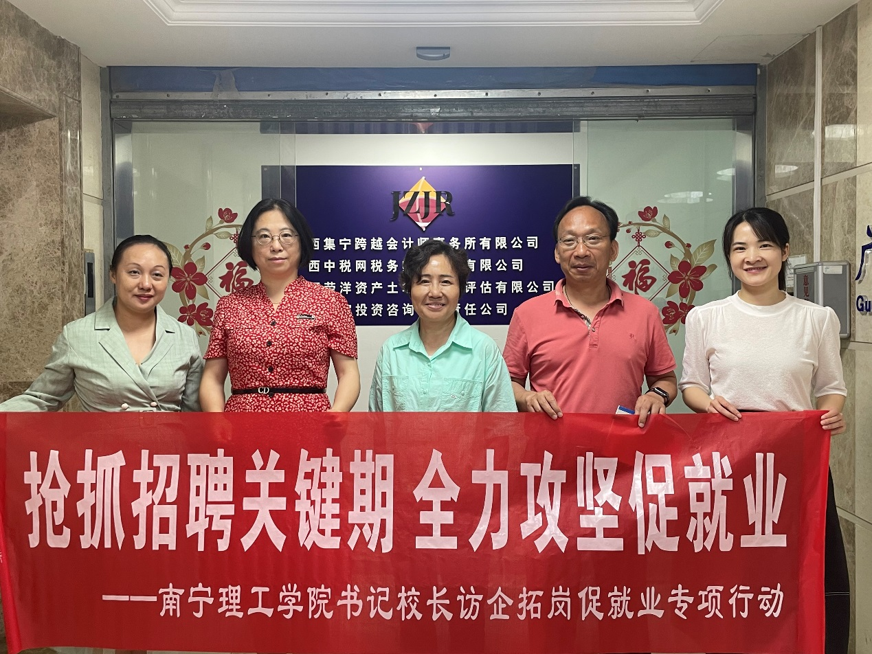2023年5月5日,南宁理工学院开展“访企拓岗促就业”系列调研活动,商学院院长高永惠、辅导员谢警黎、会计学教师黄志媛深入广西集宁跨越会计师事务所调研,开拓就业岗位、深化校企合作,促进毕业生高质量就业。