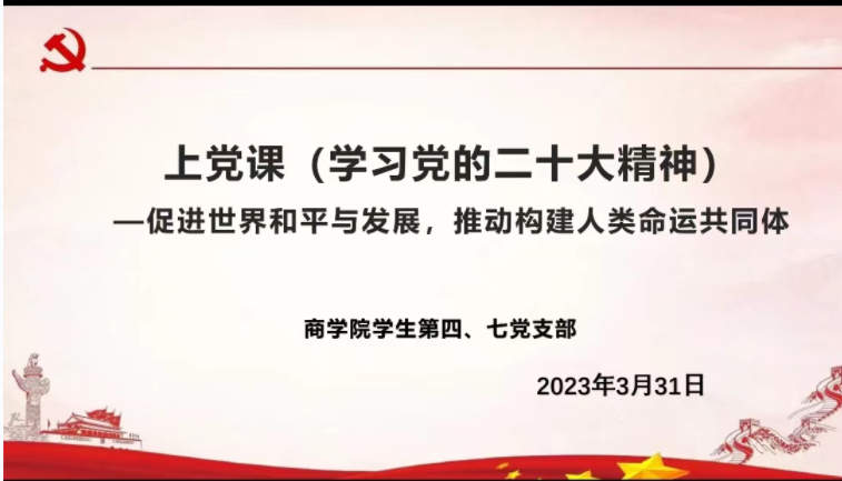 为深入学习党的二十大精神,2023年3月31日,商学院学生第四、七党支部开展了线上党课活动,学习了党的二十大精神-“促进世界和平与发展,推动构建人类命运共同体”。本次活动由支部书记李欢同志主持,支部全体党员参加。