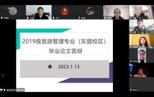 2023年1月13日,2023届旅游管理专业(东盟校区)毕业论文答辩在线上进行。参与本批次的答辩老师为旅游管理专业教室专任教师、本批次论文指导老师,以及东盟校区2023届旅游管理专业全体学生参加。