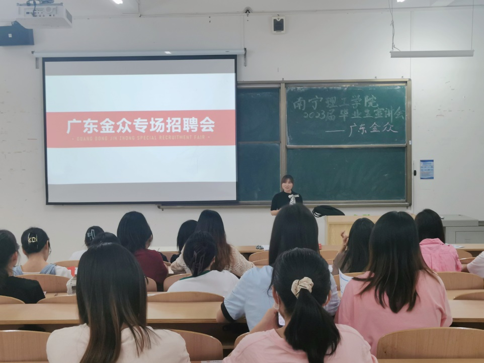 为加强商学院2023届毕业生职业认知,明确学生将来职业规划,拓宽就业渠道,搭建就业平台,10月24日晚上七点,广东金众科技有限公司在我校1109教室进行企业宣讲,为即将走入实习岗位的学子提供近距离了解企业的机会。
