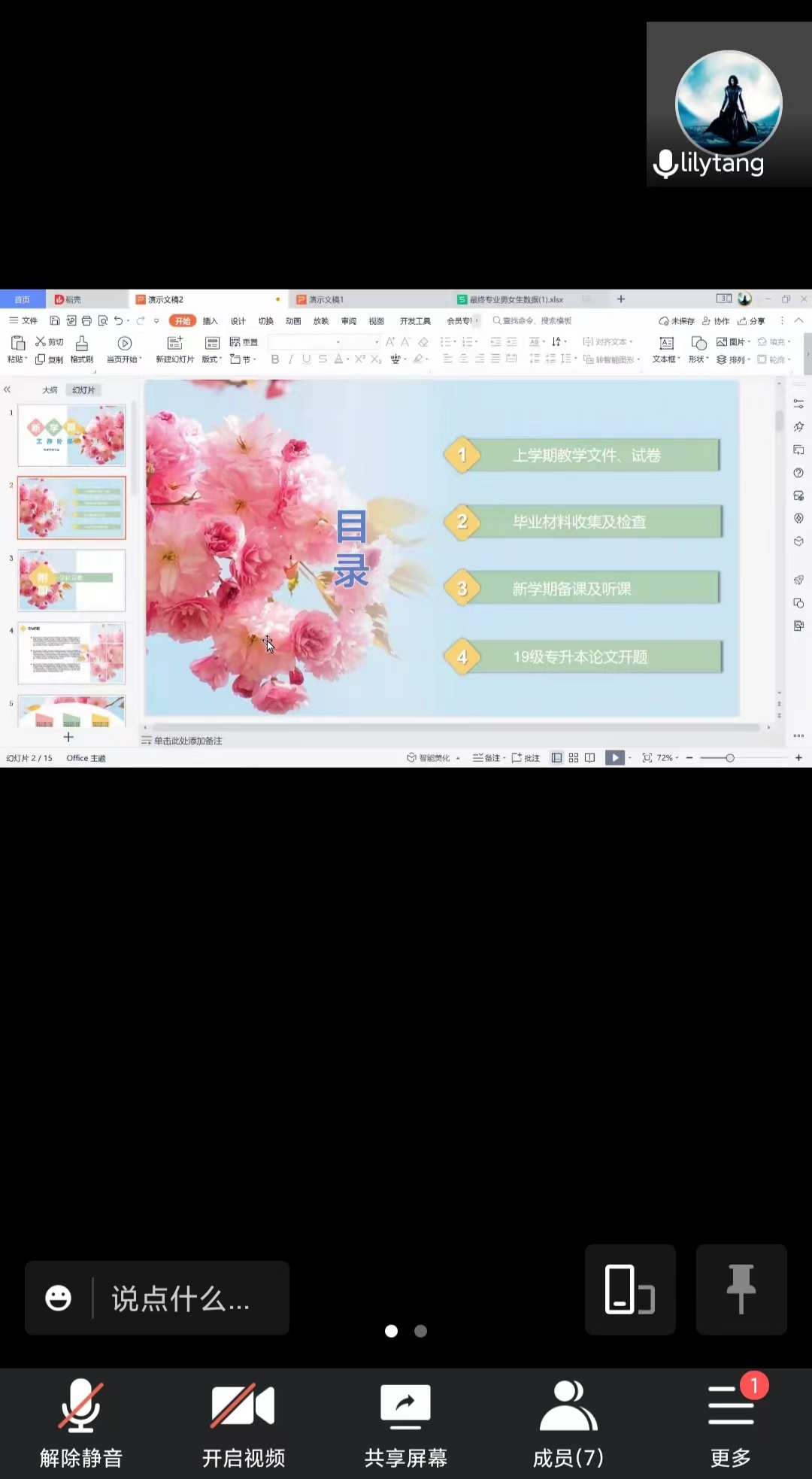 会上,教研室主任唐莉琼提出新学期开学工作主要为四个方面:第一,上学期教学文件、试卷提交完毕;第二,毕业材料收集及检查;第三,新学期备课及听课;第四,19级专升本论文开题。希望大家本学期继续认真对待教学工作,提升教学水平,帮助学生成长成才。