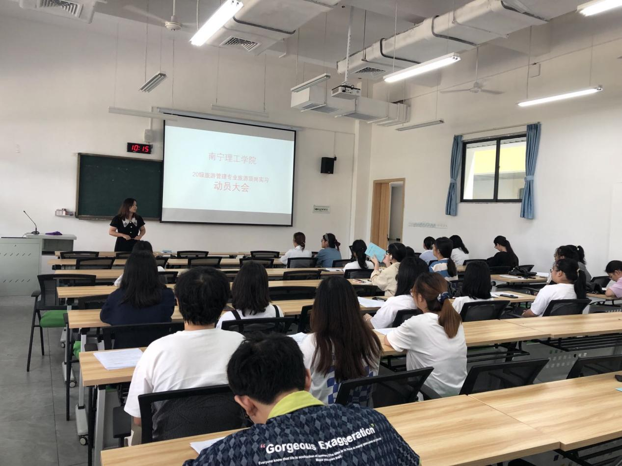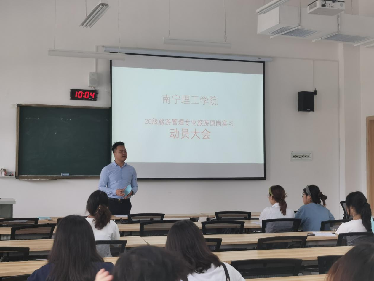 为确保顶岗实习工作的顺利开展,正确引导同学们从学生身份向职业人身份的转变,让同学们明确实习的目的、意义和要求,进一步明确就业的目标方向,2022年6月30日,在东盟校区A4102教室开展20级旅游管理专业旅游顶岗实习动员大会。本次会议由旅游教研室老师钟俊光主持,旅游教研室梁淑媚老师以及旅游管理专业 2001班全体同学参加会议。