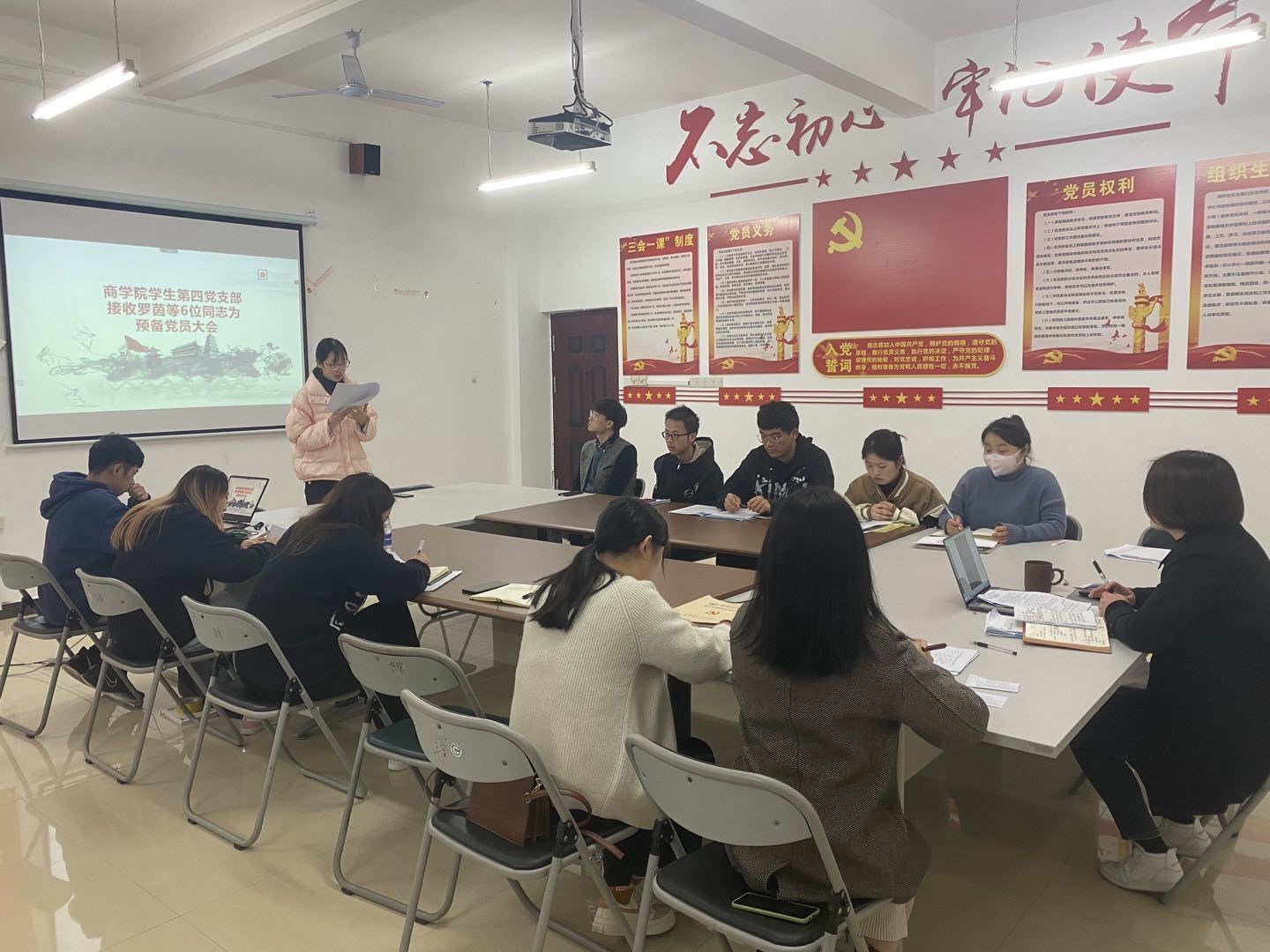 2021年12月22日,商学院学生第四党支部在1410会议室召开了接收预备党员大会,此次会议由支部书记李欢同志主持,支部全体党员、预备党员及发展对象参加会议。