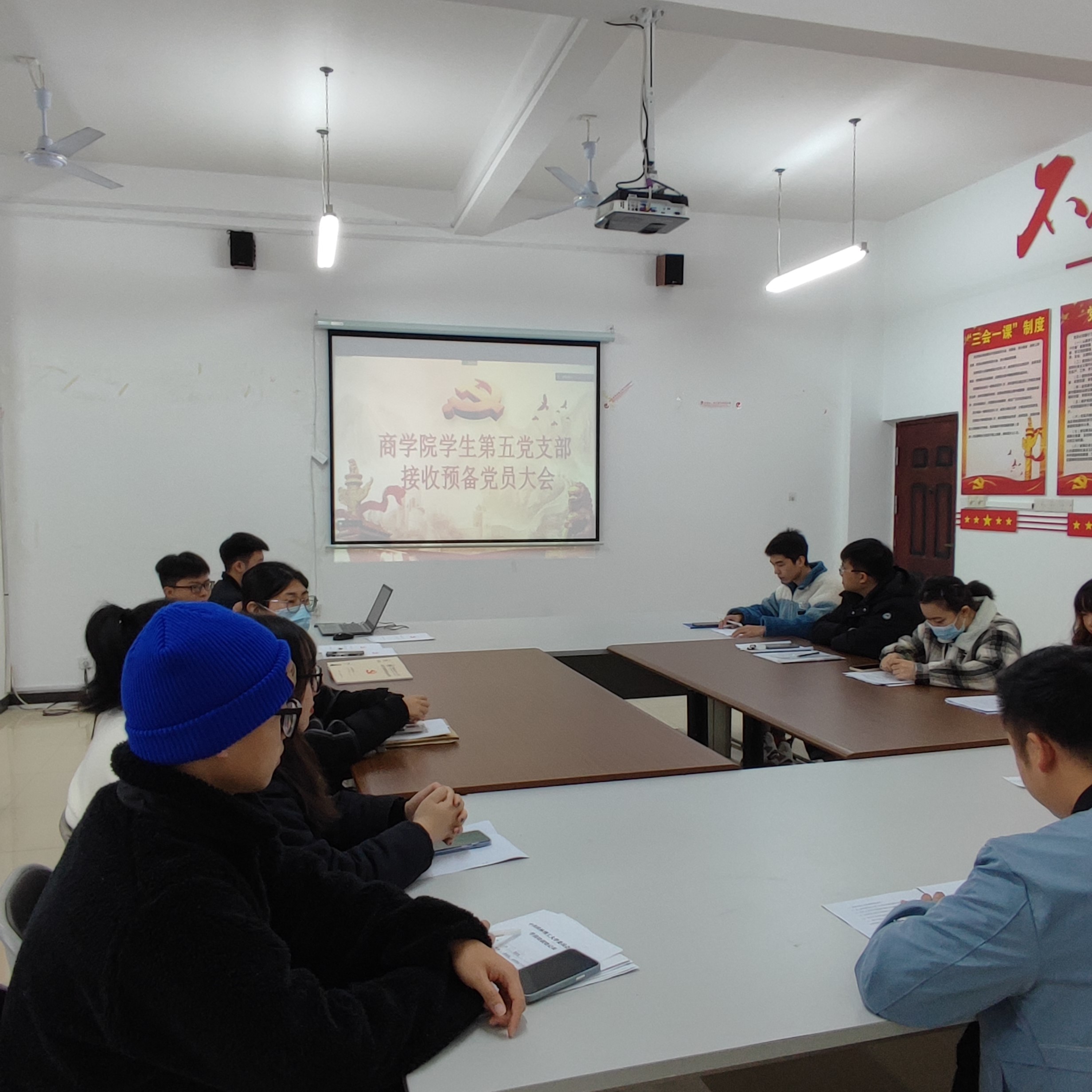 为响应党的号召,培养优秀党员,商学院学生第五党支部于2021年12月20日,在1410会议室召开接收预备党员大会,该会由商学院学生第五党支部书记吴正平同志主持,支部全体党员同志、预备党员参与此次会议