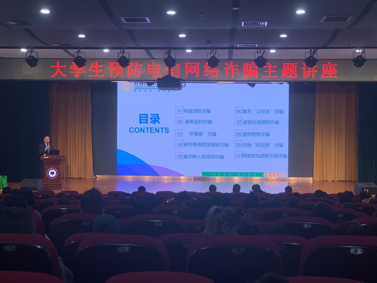 为进一步增强同学们防范电信诈骗意识,提高辨别和自我保护能力。11月10日,商学院在一栋报告厅开展预防电信诈骗专题讲座,讲座由桂林国民村镇银行刘捷经理主讲。