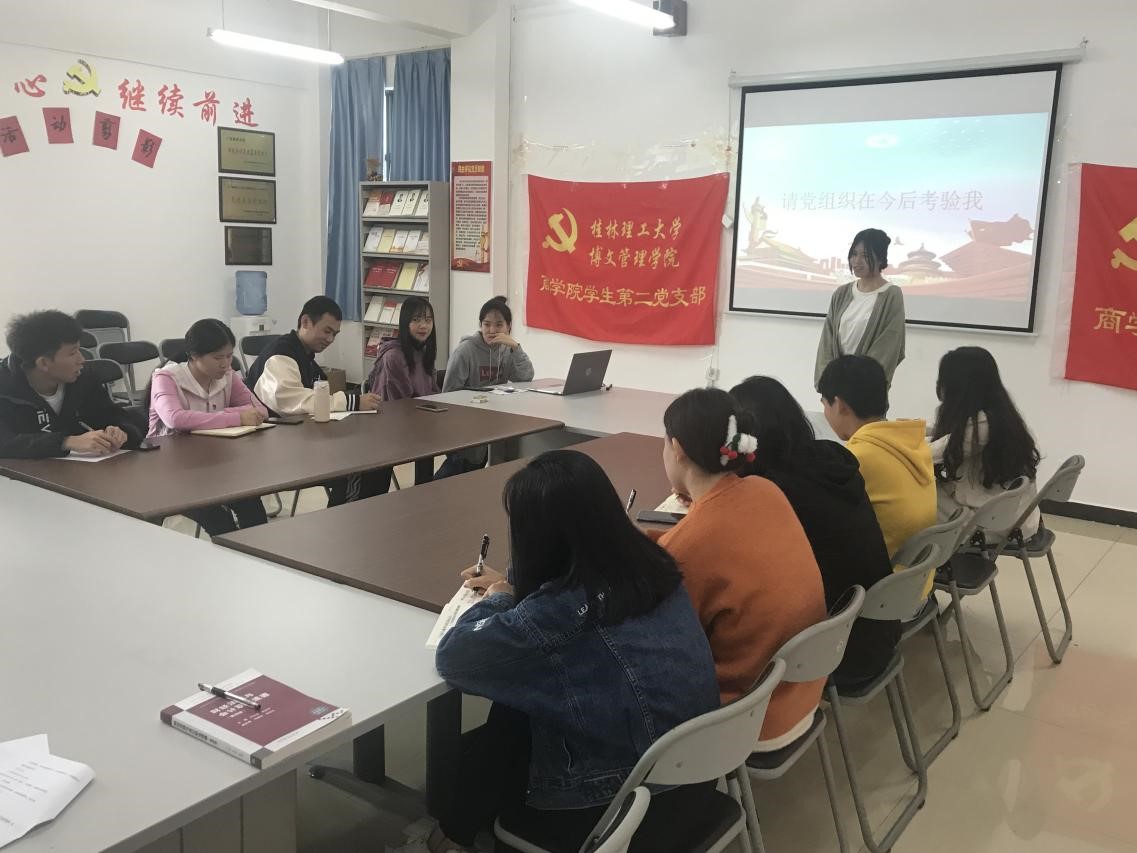 11月2日中午12点,商学院学生第二党支部在1410会议室召开入党积极分子转发展对象答辩会议。本次会议由支部书记杨明主持,特邀商学院党总支组织委员梁业武同志参加,支部全体党员、预备党员、积极分子参加本次线下会议,校外党员参加线上会议。