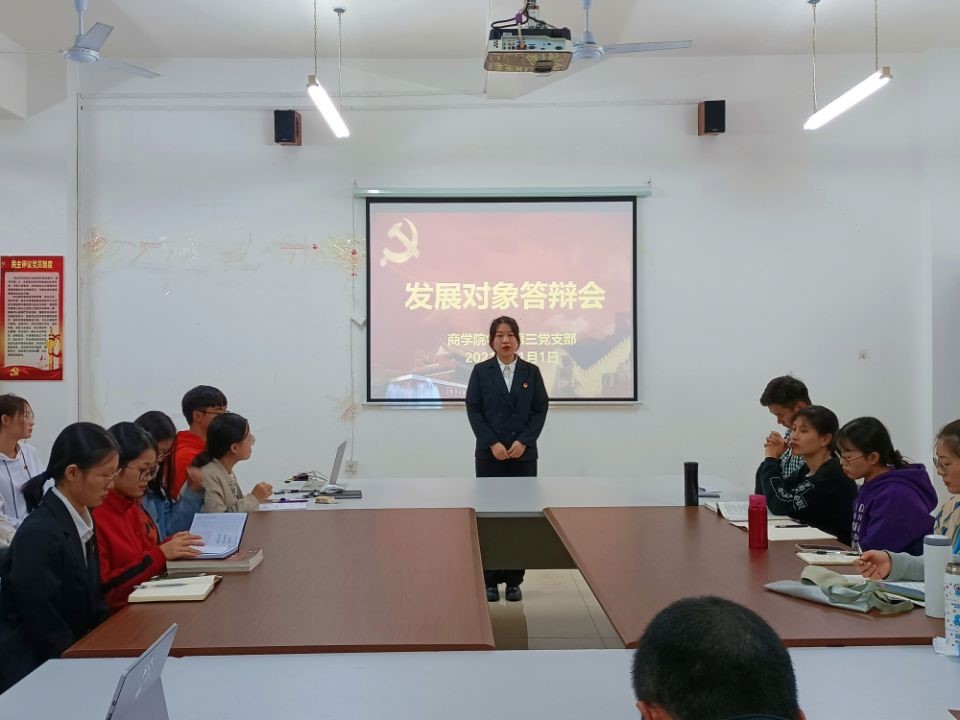 2021年11月1日下午,商学院学生第三党支部发展对象答辩会在1410会议室举行。本次大会旨在壮大优秀学生党员队伍,培养发展对象的爱党情怀和责任感,并为学生党支部的发展打下坚实的基础。本次答辩由学生第三支部书记谢启禧同志主持,本支部全体党员和预备党员参与此次答辩大会。
