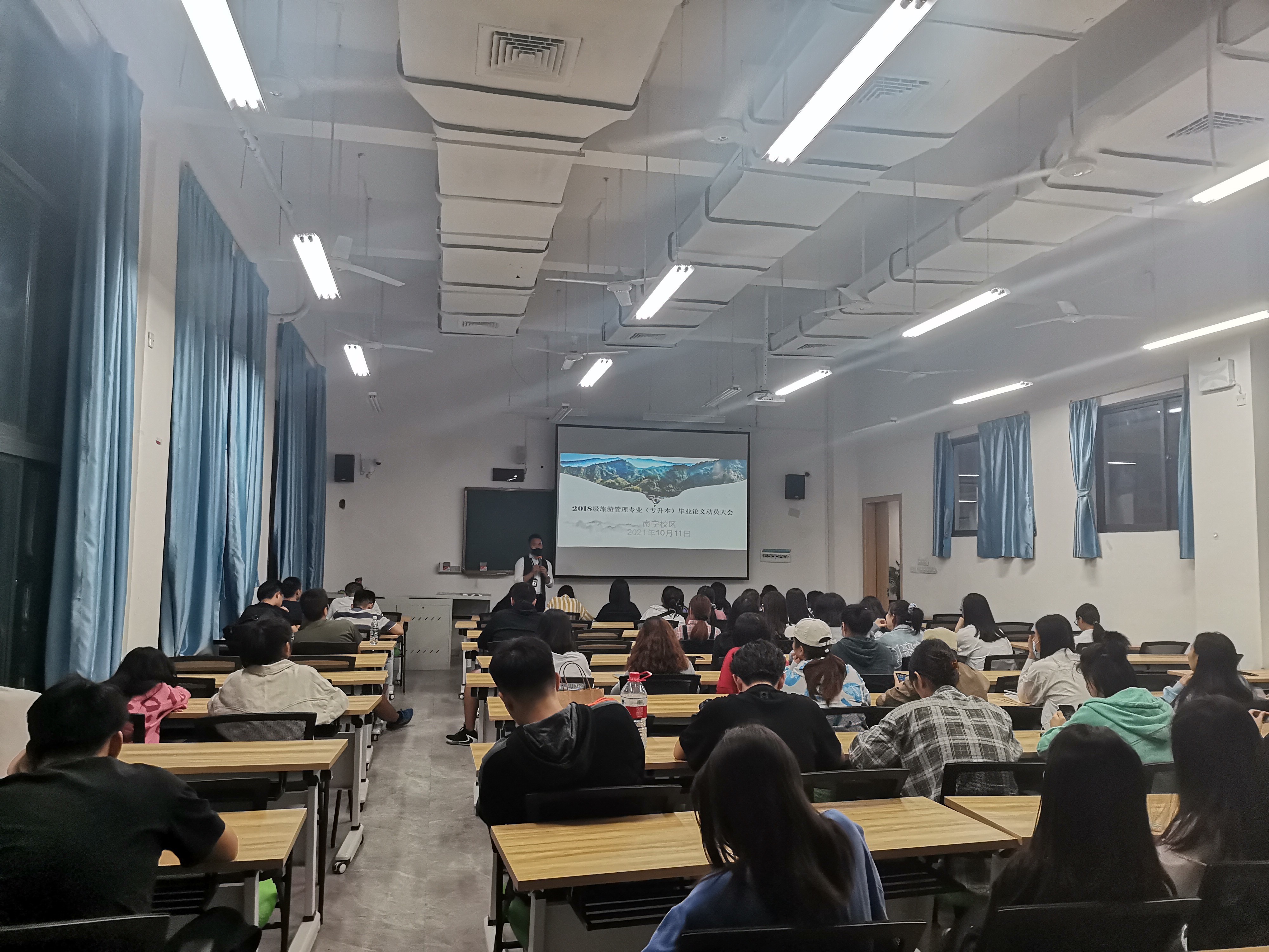 2021年10月11日,商学院旅管教研室在南宁校区A4107教室召开了2018级旅游管理(南宁校区)专业毕业论文动员大会。钟俊光老师本次动员会的主讲人。