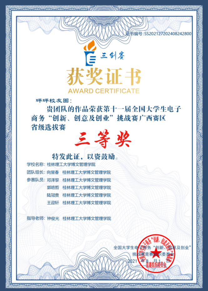 2021年6月26日,第十一届全国大学生电子商务“创新、创意及创业”挑战赛广西赛区选拔赛于广西财经学院明秀校区举办。全国大学生电子商务“创新、创意及创业”挑战赛(以下简称“三创赛”)是在2009年由教育部委托教育部高校电子商务类专业教学指导委员会主办的全国性在校大学生学科性竞赛。