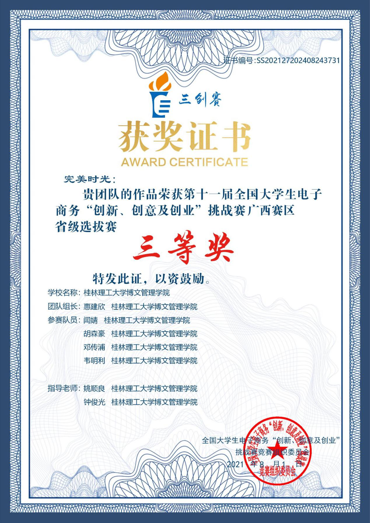 经过资格审查和校赛选拔,我校一共有四支队伍参加本次“三创赛”广西赛区选拔赛,由商学院分团委书记钟俊光老师带队,并于6月25日到达广西财经学院明秀校区报道。根据国赛竞组委的规定,省赛分为两阶段比赛。参赛队伍首先进行小组赛,小组排名后选出优胜者进入第二阶段比赛——终极PK赛,经过终极PK赛确定本届省级选拔赛的最终排名及奖项。经过一天紧张的比赛,最终,来自商学院代表全校第一次参加此次比赛的三只队伍:“砰砰校友圈”、 “互联网+”智慧云认养之南国桔子洲、“完美时光”均荣获三等奖。
