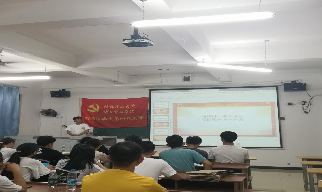 为切实加强2021届毕业生党员教育,进一步增强毕业生党员意识和党性修养,促进毕业生离校工作顺利开展。商学院学生第四党支部于2021年6月22日晚在1414多媒体教室开展“诚实守信”教育活动。此次活动由宣传委员陈明林同志主讲,全体在校毕业生党员、预备党员、发展对象参加此次活动(校外党员同志线上参与)。