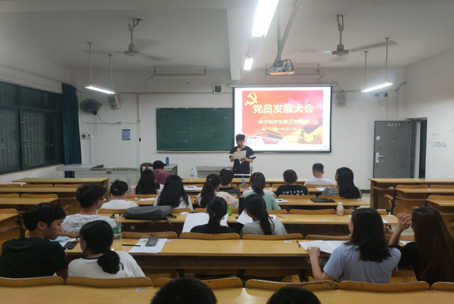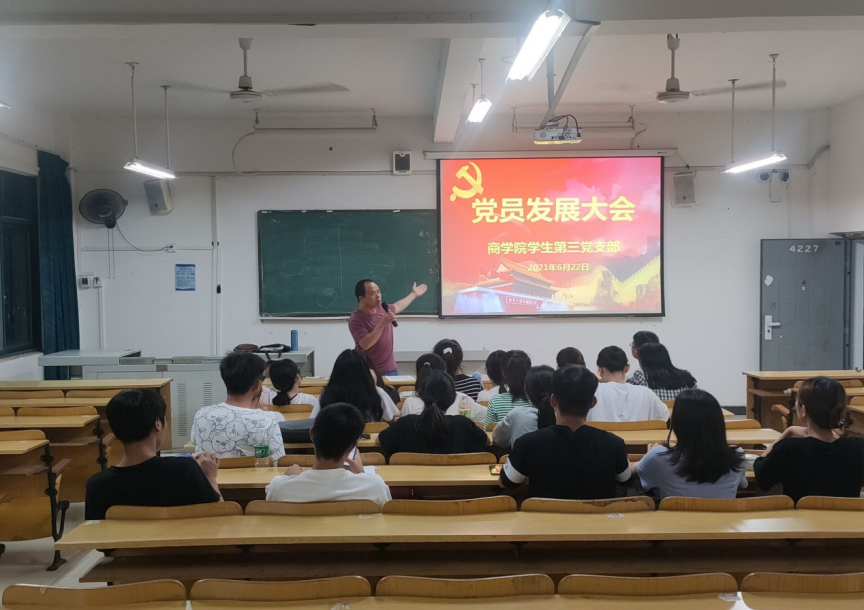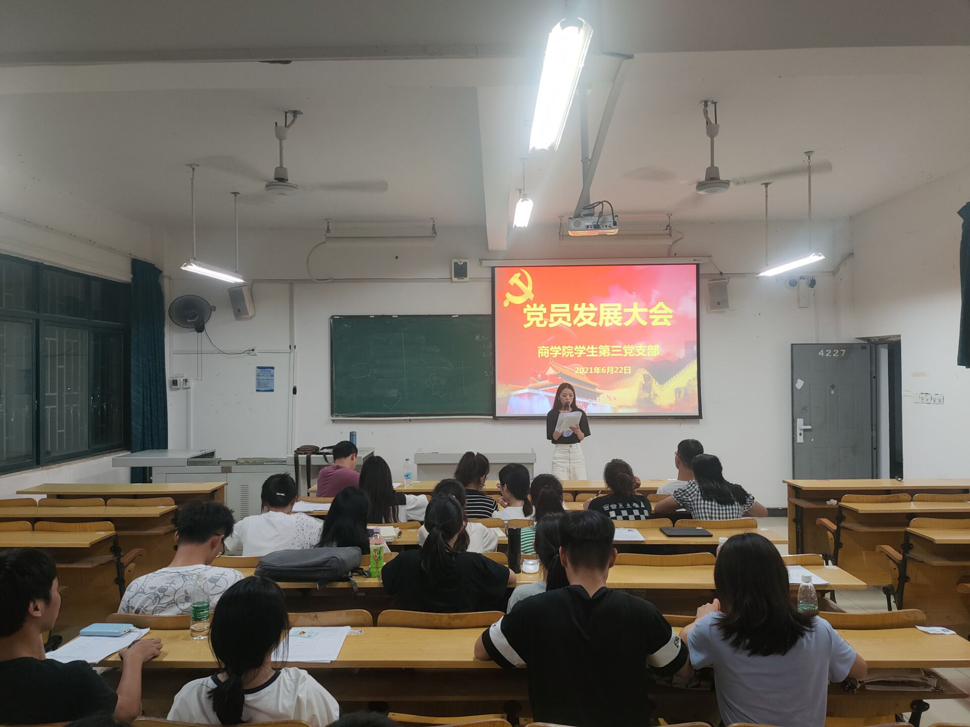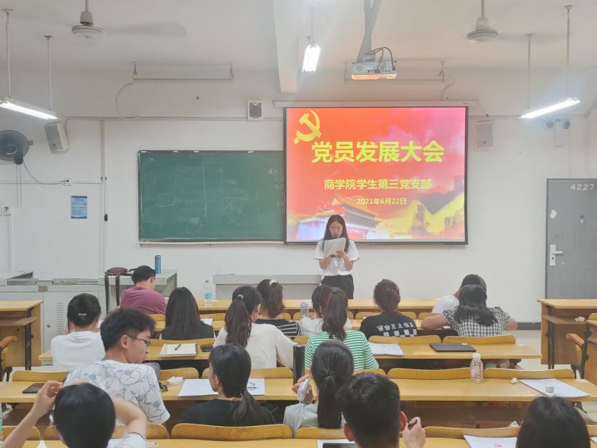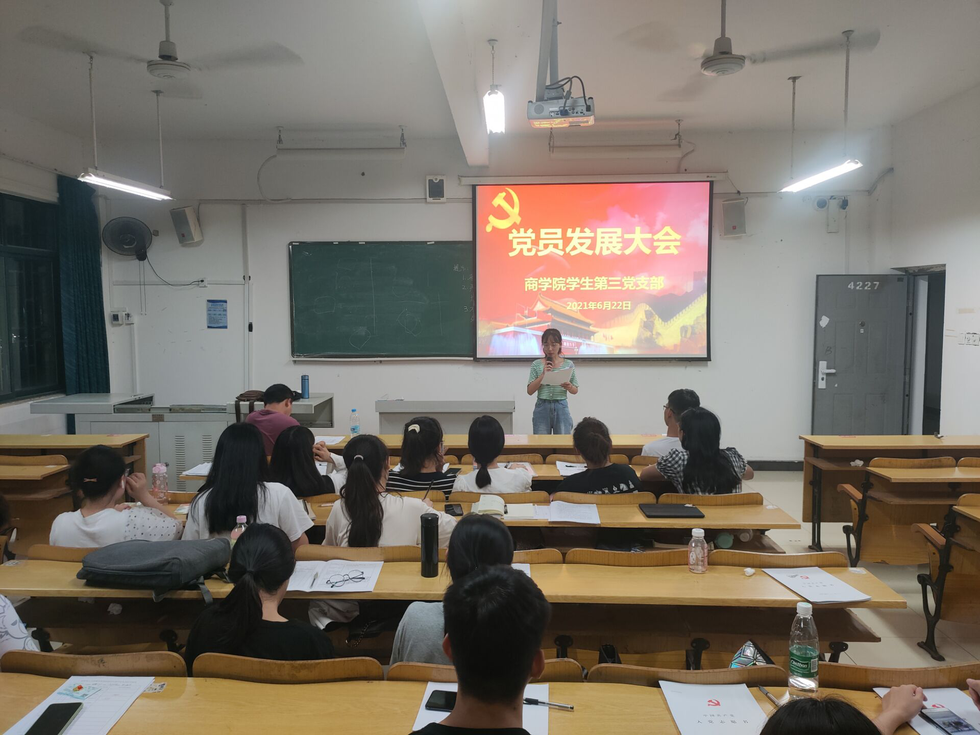 为进一步落实我院学生党支部发展党员工作计划,商学院学生第三党支部于6月22日晚在4227教室召开2021年上半年党员发展大会。会议由商学院学生第三党支部书记谢启禧同志主持,考虑17级毕业生党员同志外出实习的实际情况,会议采用线上+线下融合的方式召开,支部其余在校党员同志参加了此次会议。会议的主要是讨论党员发展对象王杰等9名同学转为预备党员的问题。