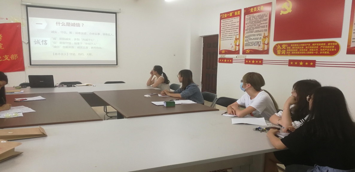 为响应商学院总支委员会开展对2021届毕业生党员主题教育实践活动,2021年6月11日下午,桂林理工大学博文管理学院商学院第一党支部开展了“诚信”的主题教育活动。活动由商学院学生第一支部书记武丽俊主持。活动通过支部同志谈各自的实习经历,对毕业生诚信的问题进行了深入的探讨,由此进一步加深了毕业生党员对诚信这一品质的认识。之后,观看了微视频《百元孤独》、《诚信与法律》等教育视频。经过集中学习,支部成员表示,会严守诚信的底线,做一名合格的讲诚信的党员!