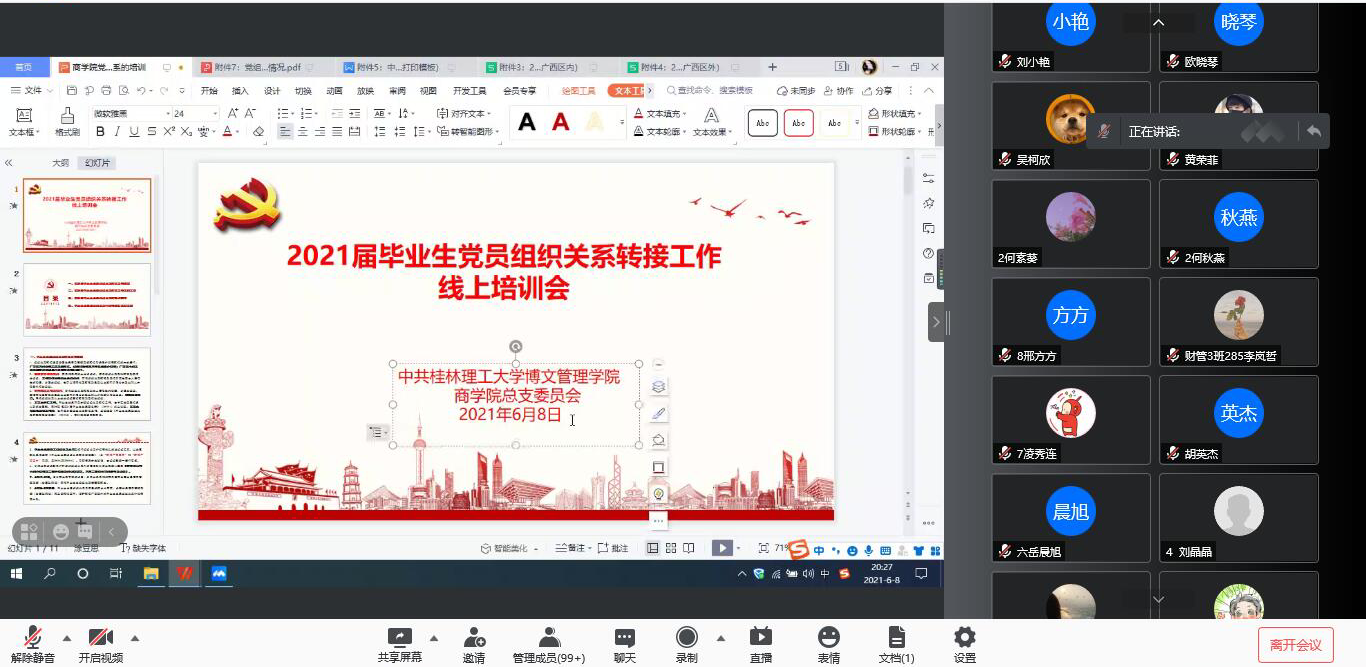 为做好2021届毕业生党员的组织关系转接工作,根据中共中央组织部《关于做好高校毕业生党员组织关系管理工作的通知》(组通字〔2015〕33号)要求,结合我院实际情况,且确保我院2021届毕业生党员组织关系顺利转接,6月8日召开2021届毕业生党员组织关系转接工作线上培训会。商学院全体毕业生正式(预备)党员参与会议,梁业武同志主持。