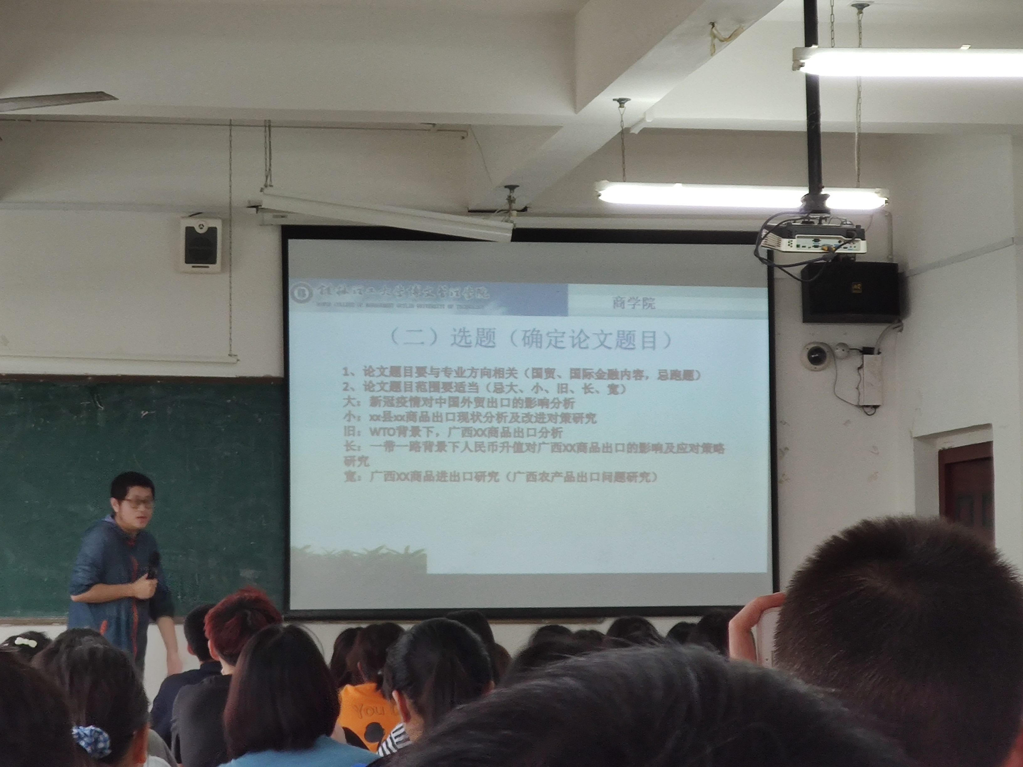 2021年5月24日,2022届国际经济与贸易实习动员暨毕业论文撰写讲座在1303教室举行;会议由国贸教研室陈宣佑老师主持,全体2018级国贸学生参加。