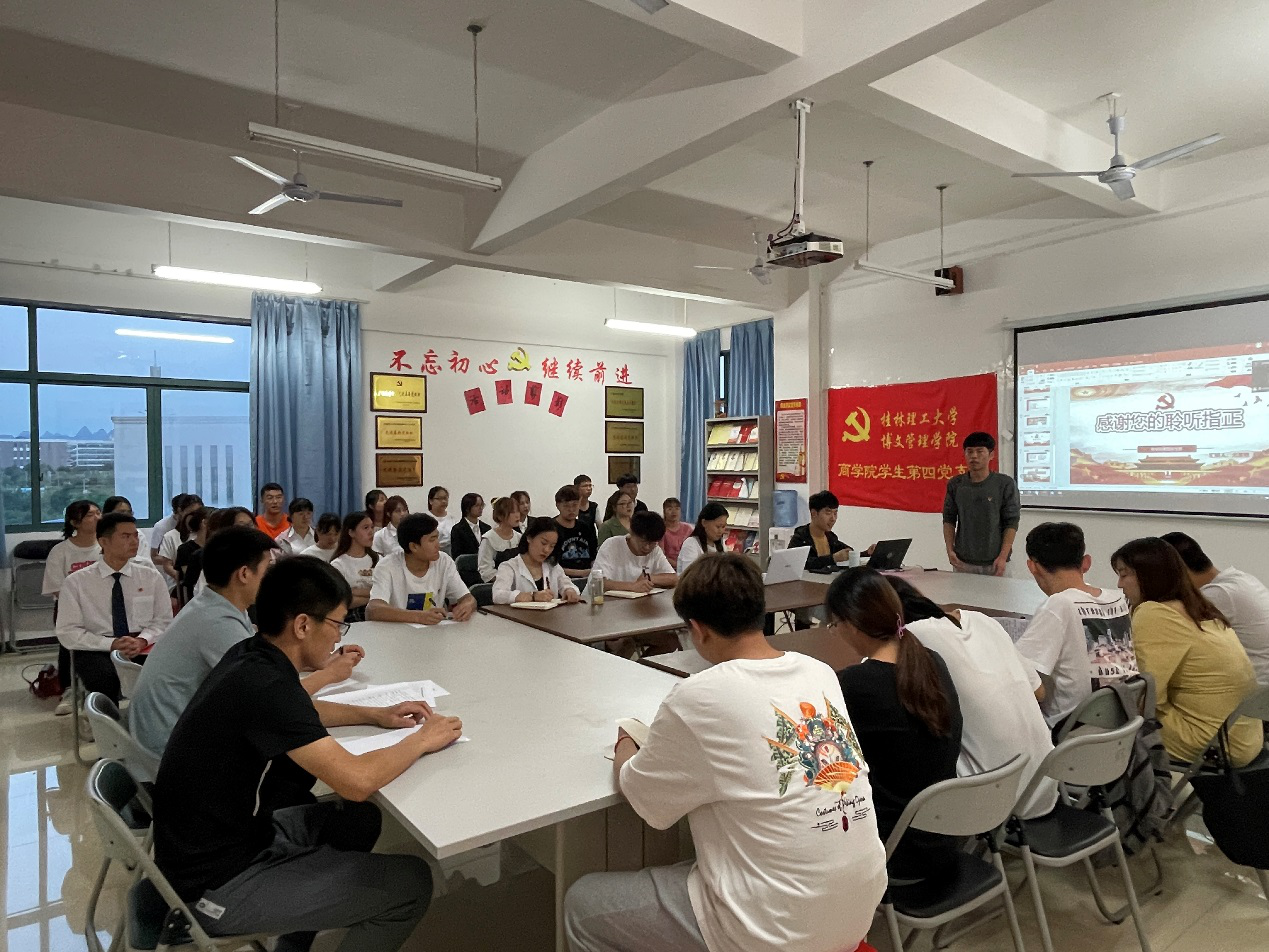 2021年5月12日晚,商学院学生第四党支部在1410会议室召开拟发展答辩会。本次会议由支部书记赵玉龙同志主持,全体在校党员、预备党员参加会议(校外党员同志线上参会)。