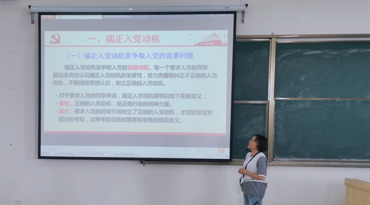 为了加强对入党积极分子的培训工作,深化如何做合格党员、正确入党的内涵、如何端正入党动机的认识,进一步提高入党积极分子的党性修养和基础理论素养,入党积极分子培训第二讲于2021年5月12日1509教室正式开课。