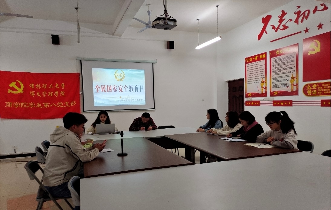 为了增强维护国家安全的意识,进一步夯实国家安全的社会基础,2021年4月6日晚上商学院学生第八党支部在1410开展了国家安全教育知识的活动,支部校外党员采取线上连线方式同在校党员、预备党员参与本次会议。
