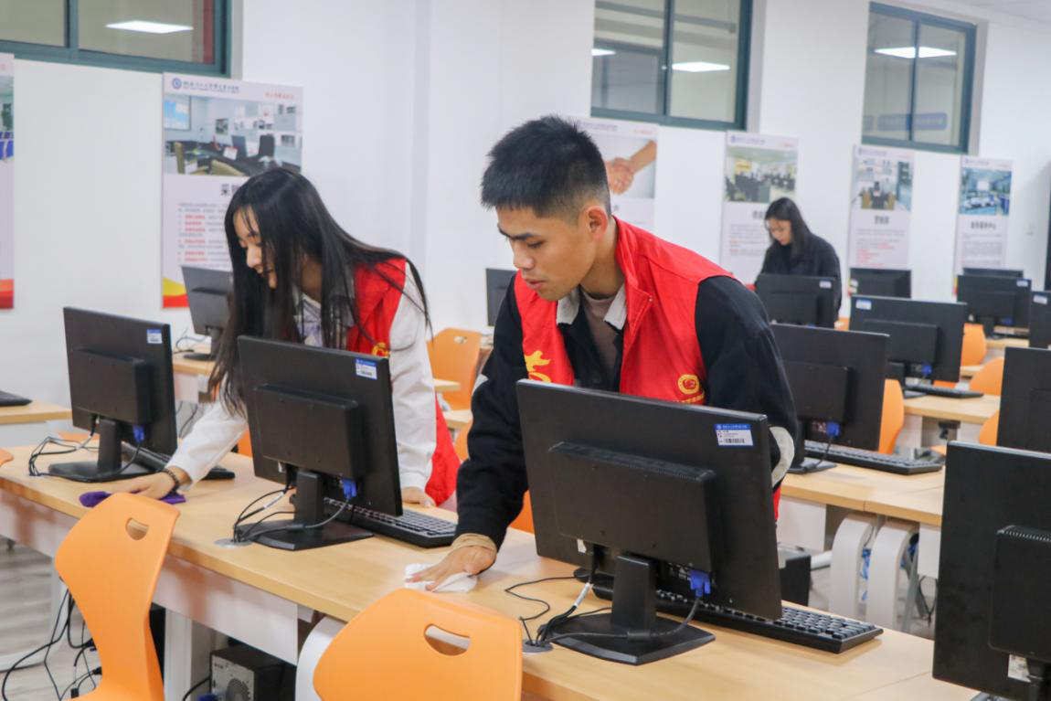 同学们抵达二栋教学楼后,分成几个团队,开始了井然有序打扫活动。清扫地面,擦拭电脑,清洁桌面。通过近一个小时的艰辛劳动,学校实验室的设备、桌面、地面焕然一新。尽管天气有点潮湿,但是同学们心里都暖阳阳的。