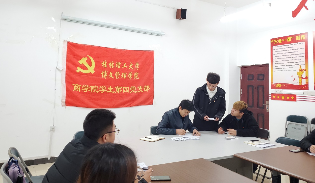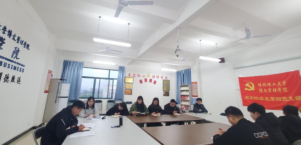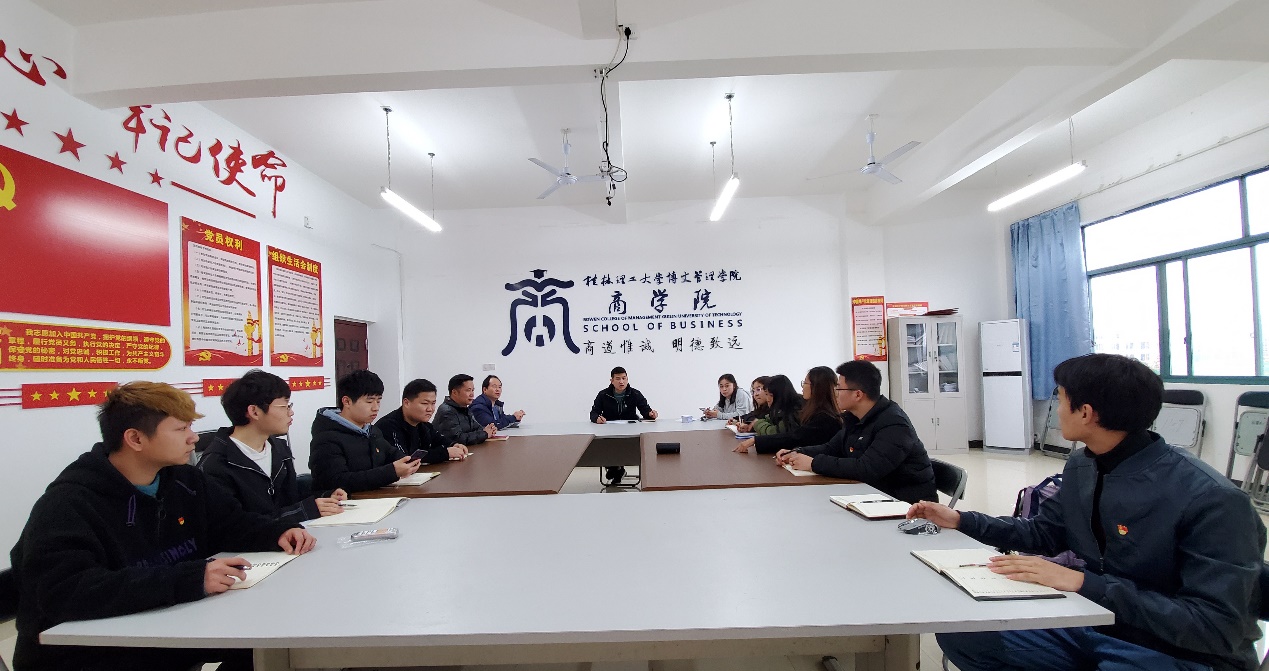 为深入学习贯彻习近平新时代中国特色社会主义思想、党的十九届五中全会精神,提升基层党组织政治功能和组织力,根据党章、《中国共产党支部工作条例(试行)》、《中国共产党党员教育管理工作条例》等规定和《中共广西壮族自治区委员会组织部关于召开2020年度基层党组织组织生活会和开展民主评议党员的通知》(桂组通字 (2020) 90号)文件精神,严格落实学校党委的工作部署,2021年3月12日,商学院学生第四党支部在1410会议室召开2020年度基层组织生活会暨民主评议会。商学院总支委员谢启禧同志、商学院学生第五党支部书记吴正平同志列席会议。本次会议由支部书记梁业武同志主持,全体在校党员、预备党员参加会议(校外党员同志自行线上参加会议)。