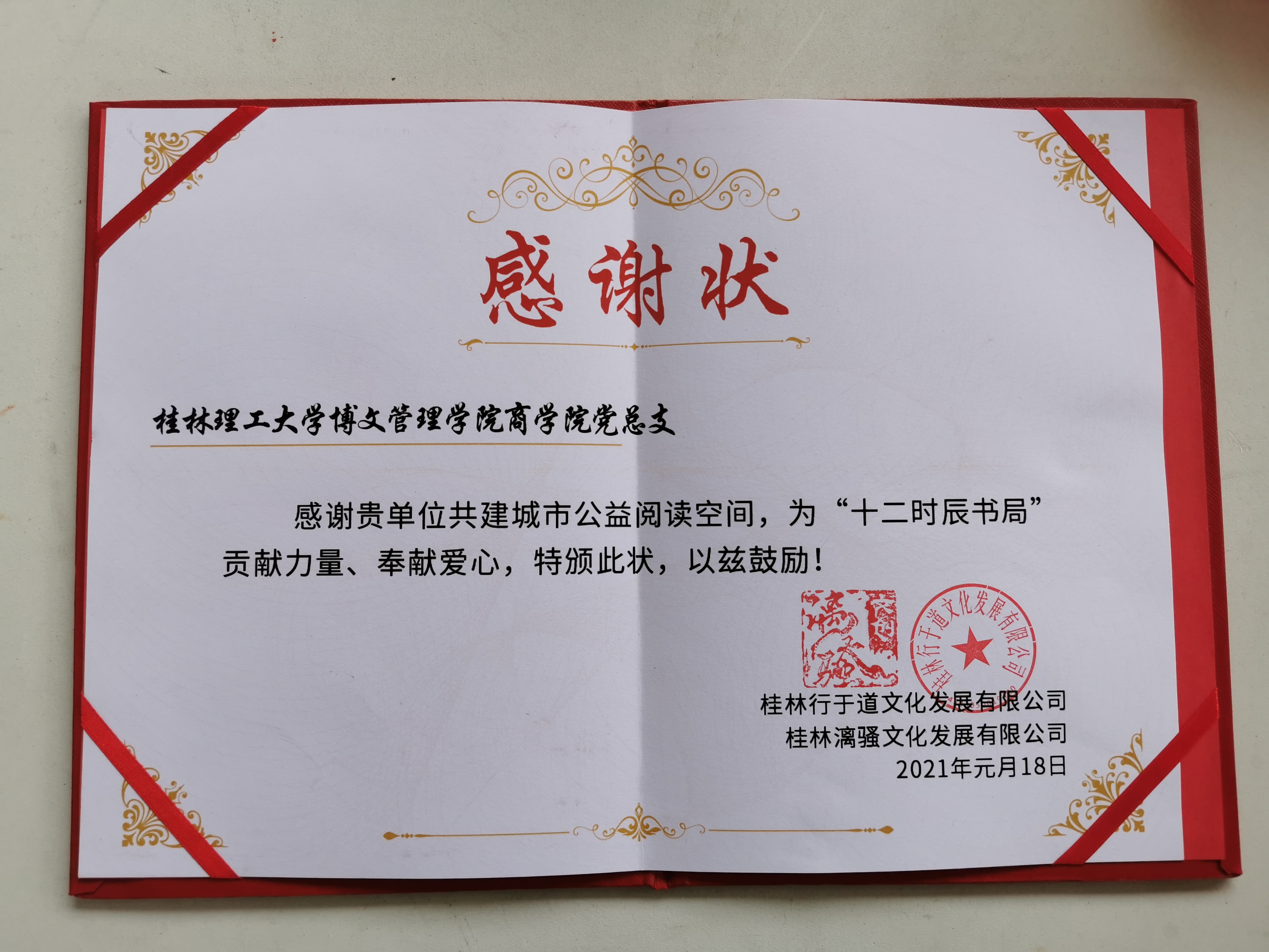 为了点燃社会各界参与公共文化服务的热情,更好的整合公益阅读力量和促进阅读的推广服务。1月17日,在桂林市十二时辰书局成立一周年之际,活动在商学院党总支副书记、商学院分团委书记带领下以及六名学生志愿者十二时辰书局邀请下参加一周年庆典活动。
