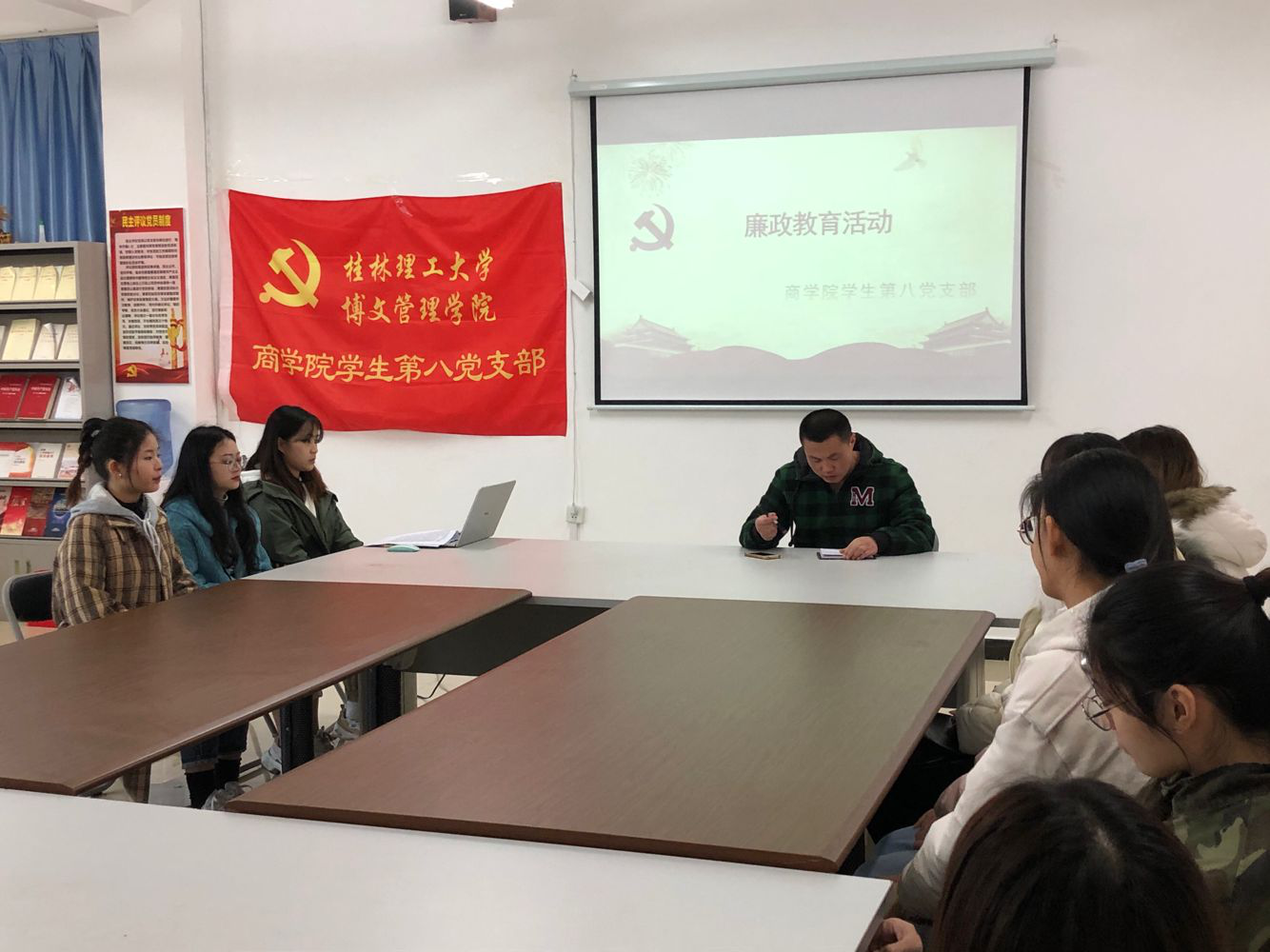 为加强党风廉政宣传教育,提高广大学生党员的廉洁素养,帮助学生党员形成健全人格,12月6日下午,商学院学生第八党支部在1410教室开展了廉政教育活动。