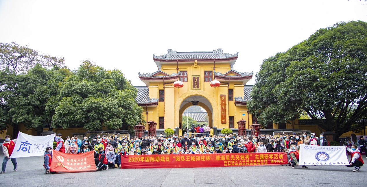 在12月3日国际助残日到来之际,桂林理工大学博文管理学院在桂林市东西巷、靖江王城景区开展"阅尽王城知桂林·璀璨星光亮独秀"主题的关爱特殊儿童研学活动。桂林市临桂区特殊教育学校全体师生、家长在大学生志愿者的带领下,在桂林市秀峰区档案室、桂林市东西巷讲古堂和桂林月亮粑粑话剧社相关负责人的陪同下两百多号人共同参与整个研学活动过程中。