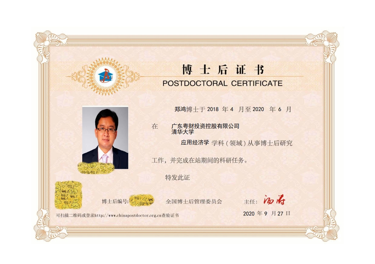 恭喜我校商学院优秀学子郑鸿,在应用经济学学科(金融学方向)开展一系列研究工作,于今年6月完成清华大学经济管理学院与广东粤财投资控股有限公司联合培养的博士后在站期间科研任务,顺利出站,获得博士后证书。