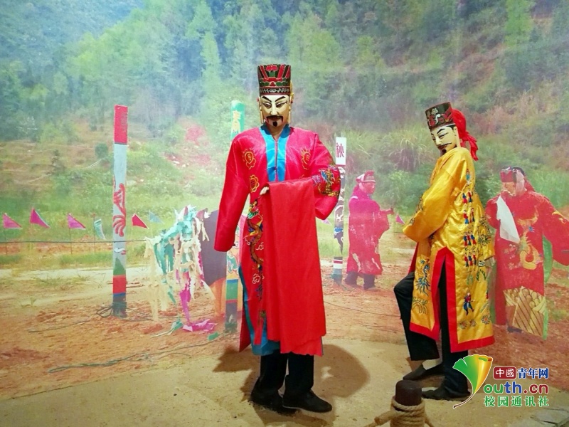 进入博物馆一楼的“专题展区”,它设有毛南族“肥套”、毛南族分龙节、民族民间传统体育、毛南族花竹帽编织技艺等专题。展品里,形形色色的民族文化工艺琳琅满目,人物模型惟妙惟肖,生动形象的展现了环江毛南族自治县的民俗文化风采。最令我深刻的是毛南“肥套”文化,千奇百怪的傩面具,神秘多彩的歌舞祭祀活动,强烈的文化气息让我充满了对自然的新奇与渴望。