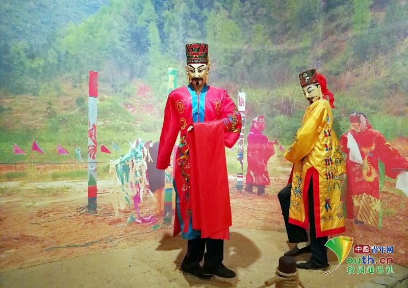 根据博物馆相关文字介绍,团队成员们了解到博物馆一楼为“专题展区”,设有毛南族“肥套”、毛南族分龙节、民族民间传统体育、毛南族花竹帽编织技艺、铜鼓铸造技艺等五个专题。毛南族的“肥套”活动是一种通过结合歌、舞、乐、戏等的艺术形式来祭祀天地的活动。实践团队成员首次认识环江“肥套”文化,就被它的独特性和神秘感所吸引住。同时环江毛南族的特色傩面具,是“肥套”活动中必不可少的。傩面具分有多种神态,不同的神态也有不同的面部颜色,看起来十分的惟妙惟肖、栩栩如生。可见雕刻师傅的手艺有多精湛,每一个细节都处理得十分得完美,也体现了毛南人对自然天地的敬畏之心。