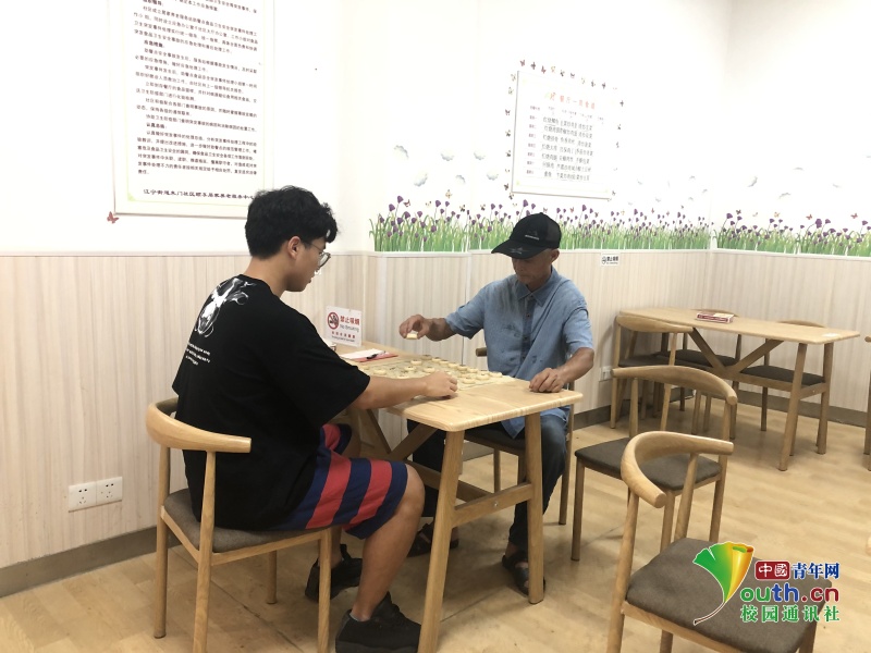 图为在村活动中心与老书记对弈