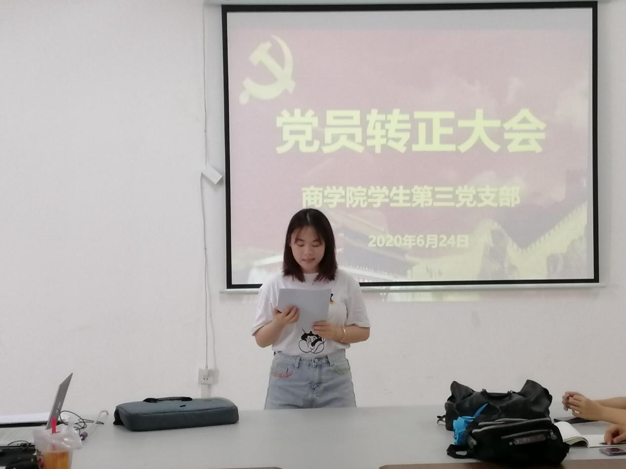 为深入贯彻党的理论方针,商学院学生第三党支部于6月24日在1410会议室召开2020年上半年党员转正大会。参加本次会议的有支部书记同志和支部全体学生党员,会议围绕皮雨苹等6名同志转为中共正式党员进行讨论和表决。